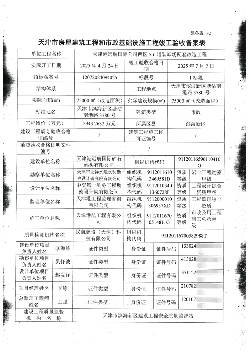 天津港远航国际公司西区5-6道装卸场配套改造工程竣工验收备案表