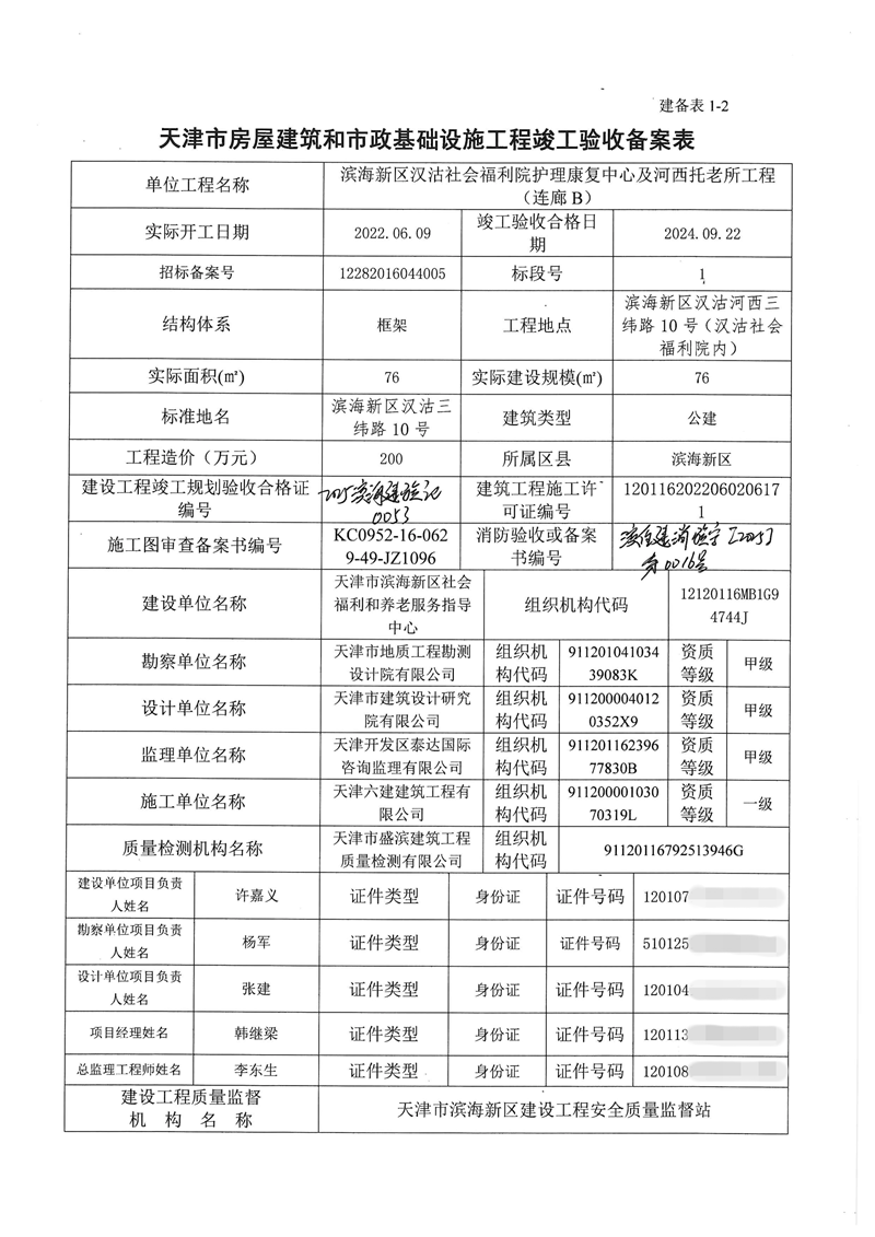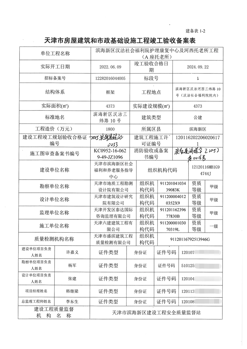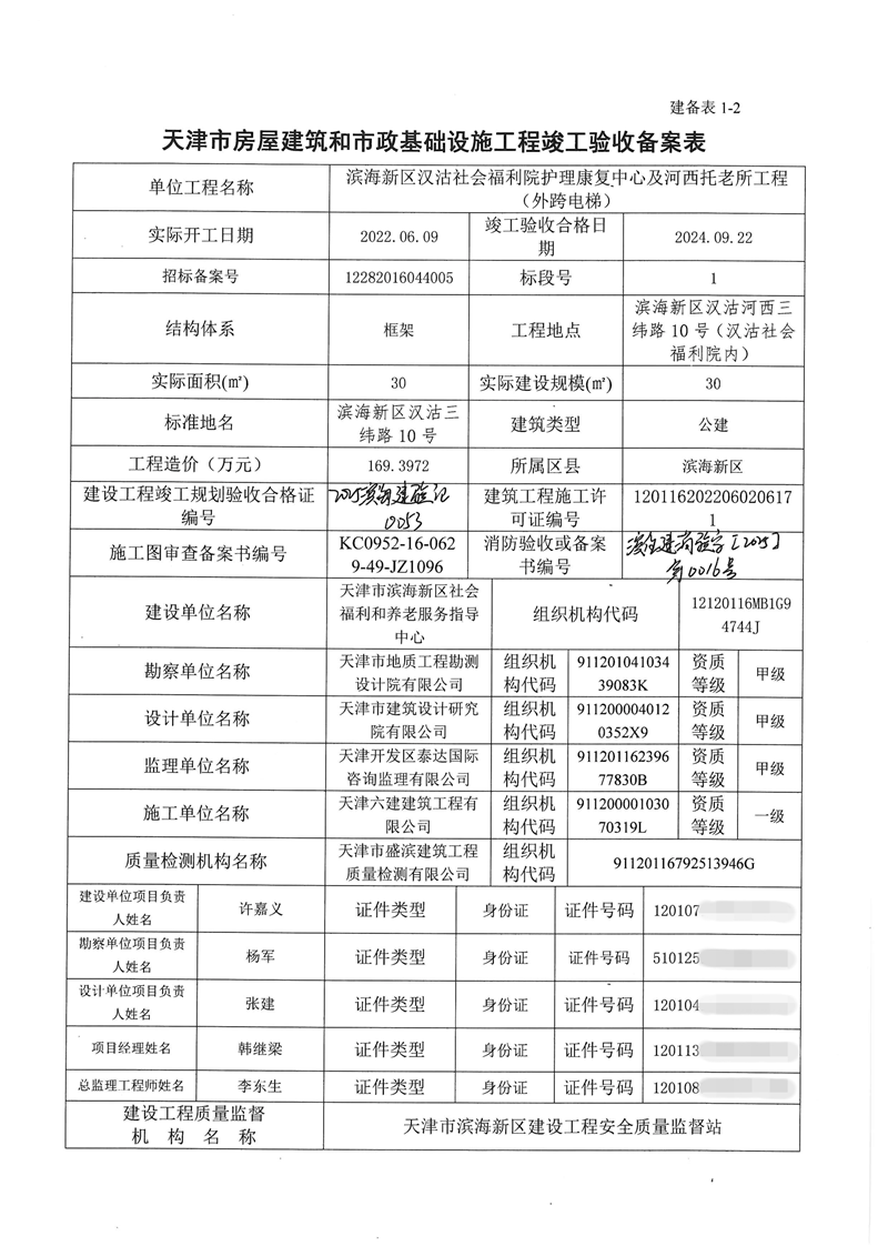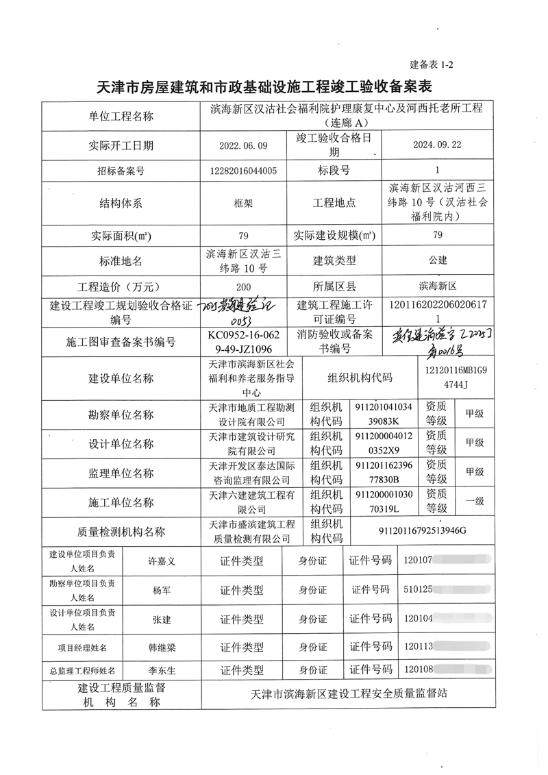 滨海新区汉沽社会福利院护理康复中心及河西托老所工程竣工验收备案表