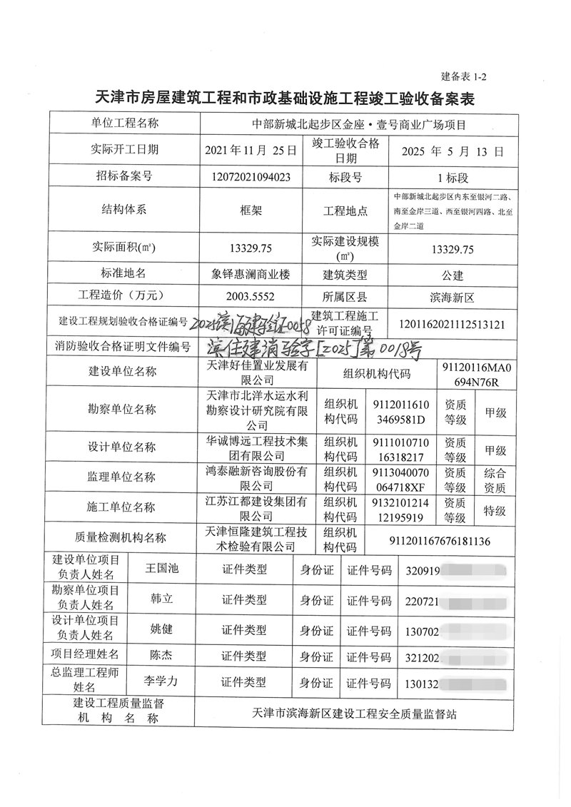 中部新城北起步区金座·壹号商业广场项目竣工验收备案表