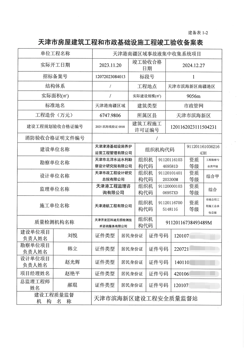 天津港南疆区域事故液集中收集系统项目竣工验收备案表