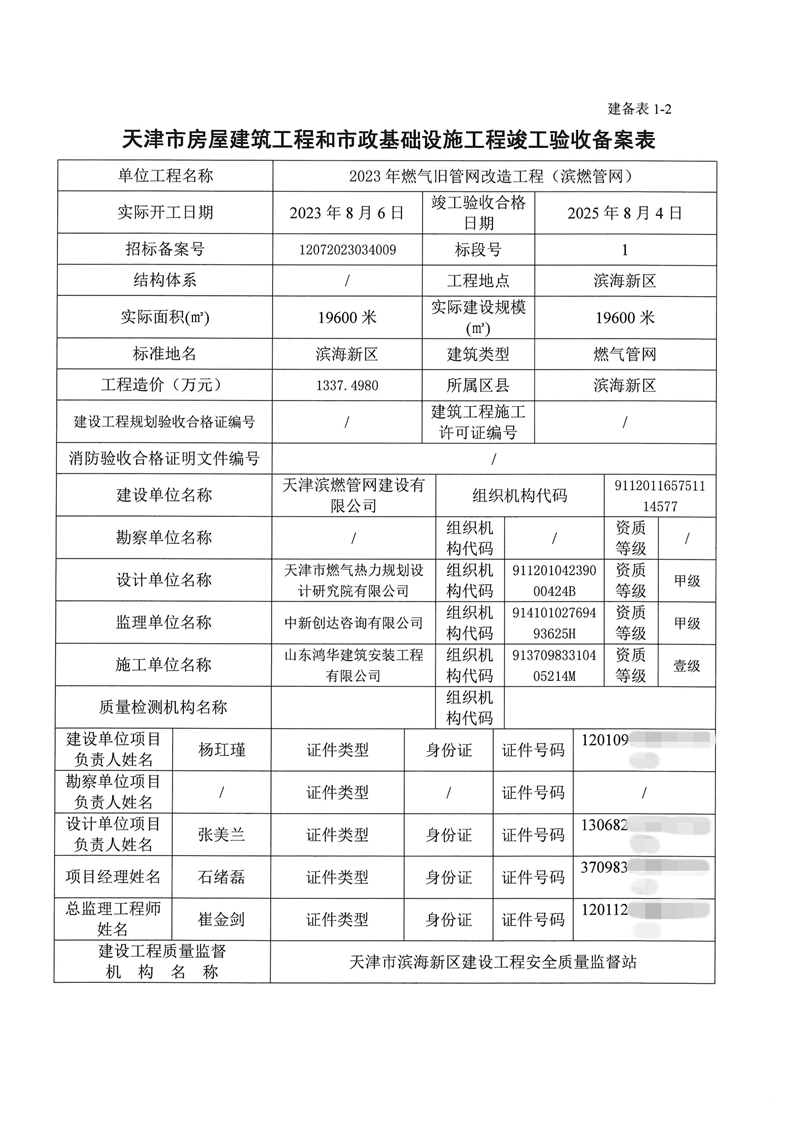 2023年燃气旧管网改造工程(滨燃管网)竣工验收备案表
