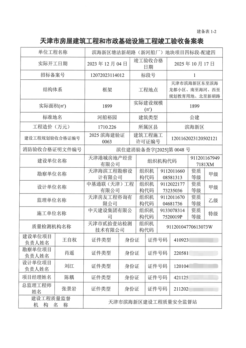 滨海新区塘沽新胡路(新河船厂)地块项目四标段-配建四竣工验收备案表
