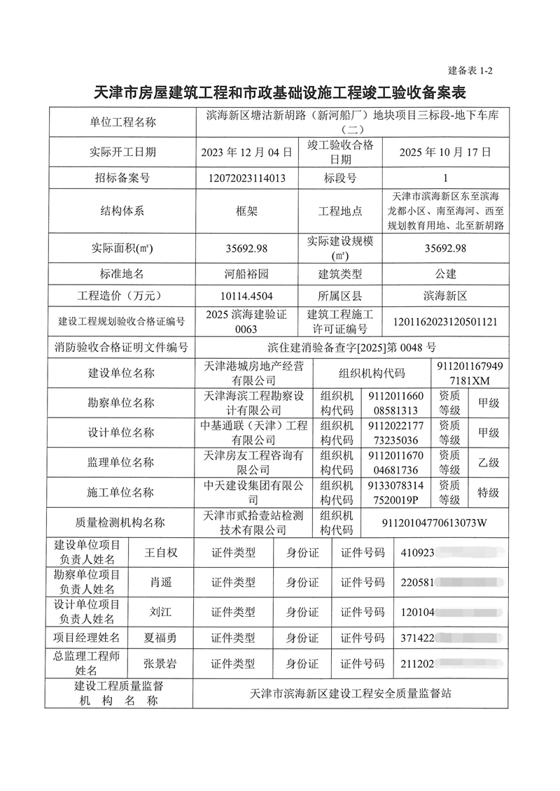 滨海新区塘沽新胡路(新河船厂)地块项目三标段-地下车库(二)竣工验收备案表