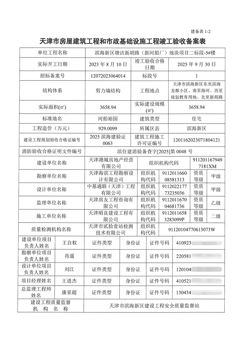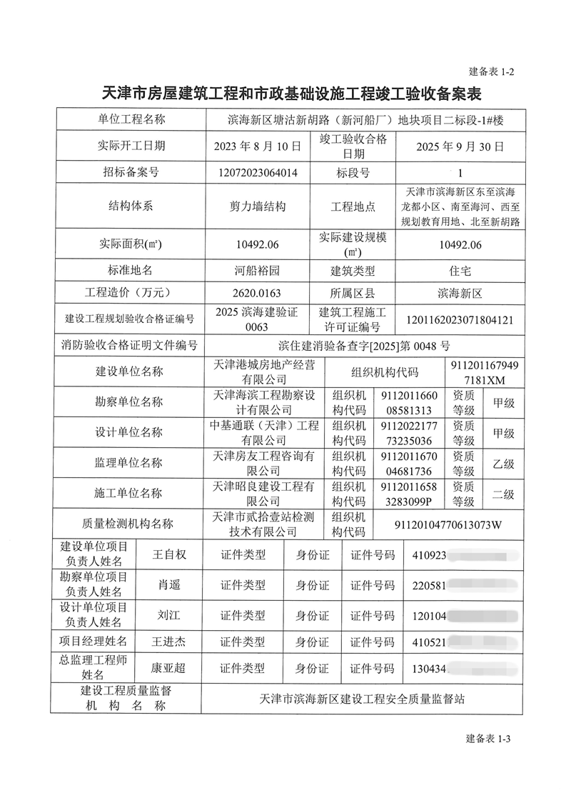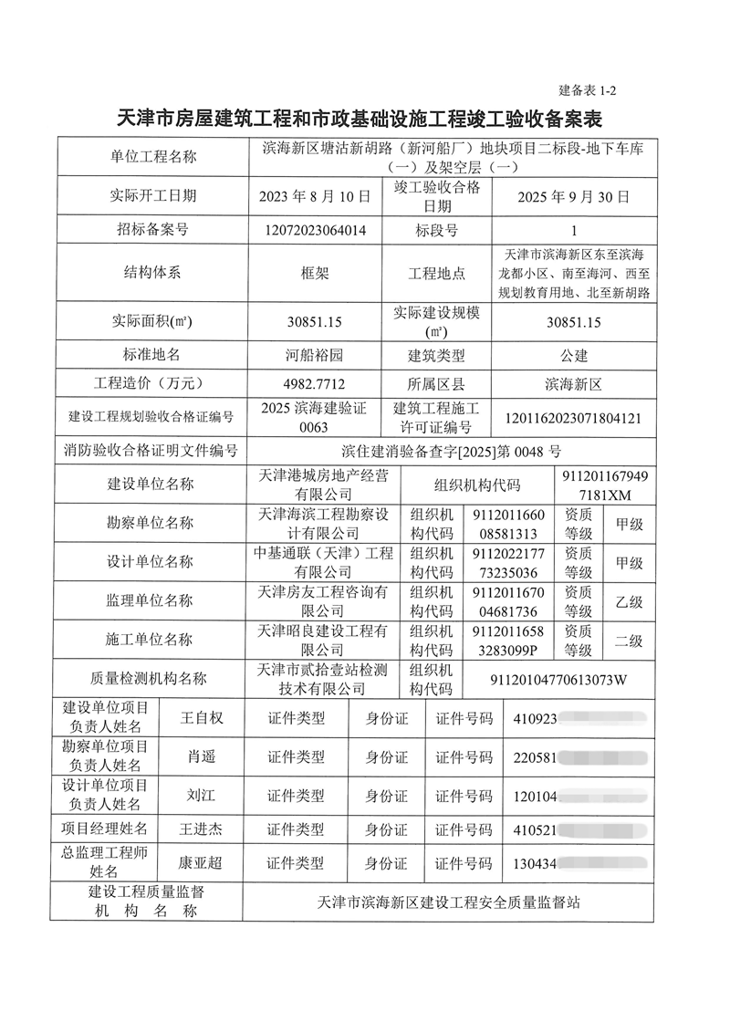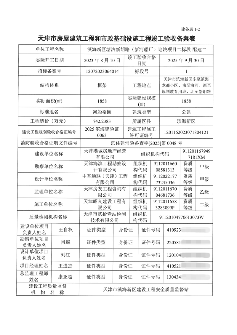 滨海新区塘沽新胡路(新河船厂)地块项目二标段竣工验收备案表