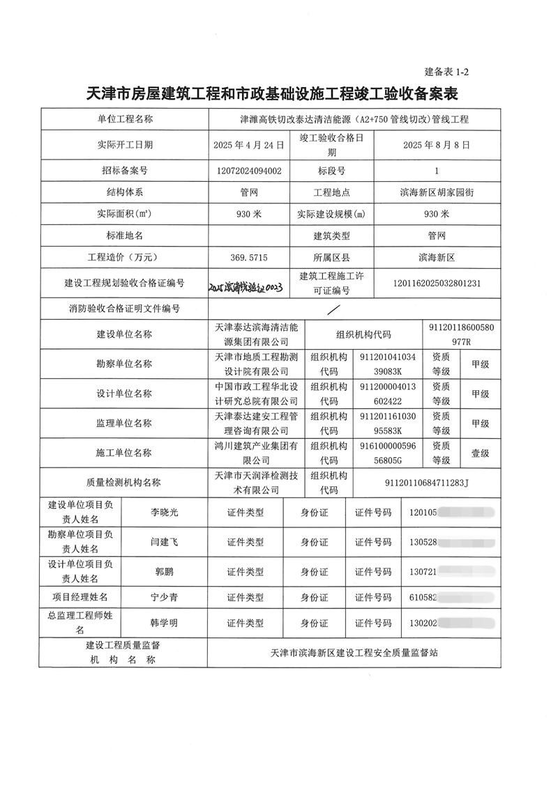 津潍高铁切改泰达清洁能源(A2+750管线切改)管线工程竣工验收备案表