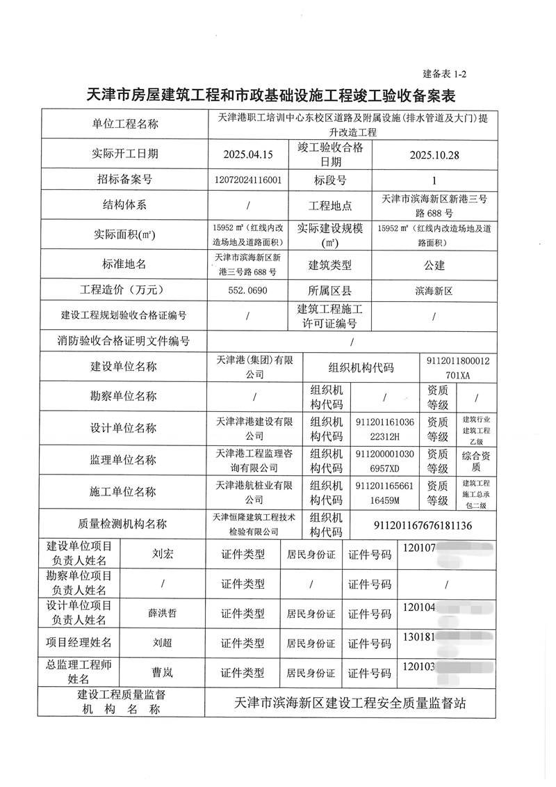 天津港职工培训中心东校区道路及附属设施(排水管道及大门)提升改造工程竣工验收备案表