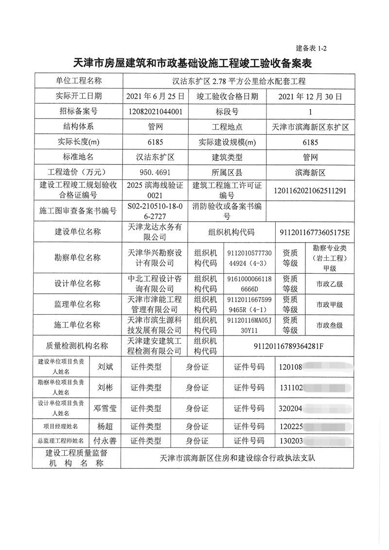 汉沽东扩区2.78平方公里给水配套工程竣工验收备案表
