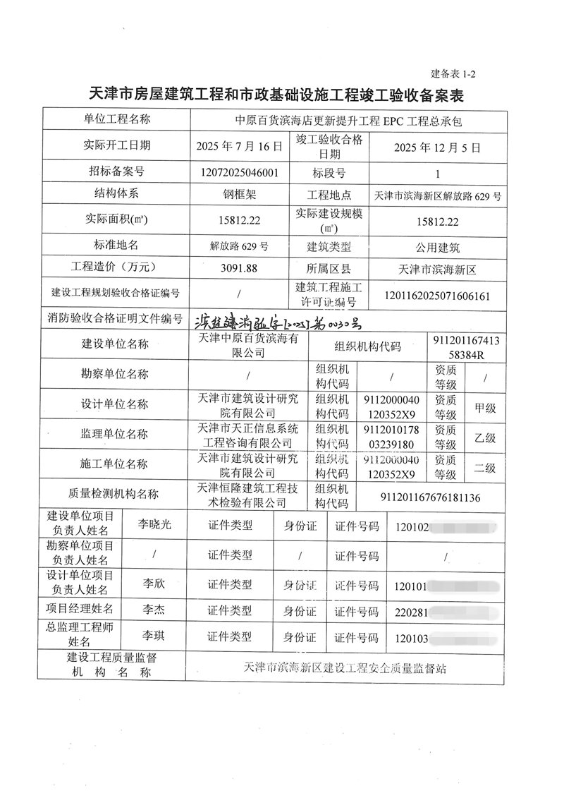 中原百货滨海店更新提升工程EPC 工程总承包竣工验收备案表
